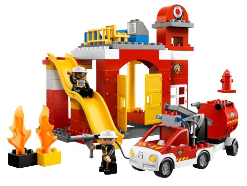 - Includes 2 firemen LEGO DUPLO figures and features fire vehicle with trailer, slide, garage, office and computer